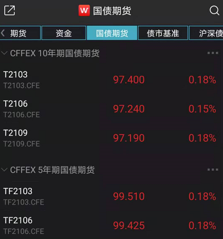 当天上午10点20分左右,10年期主力合约涨0.18%,5年期主力合约涨0.18%,2年期主力合约涨0.11%。