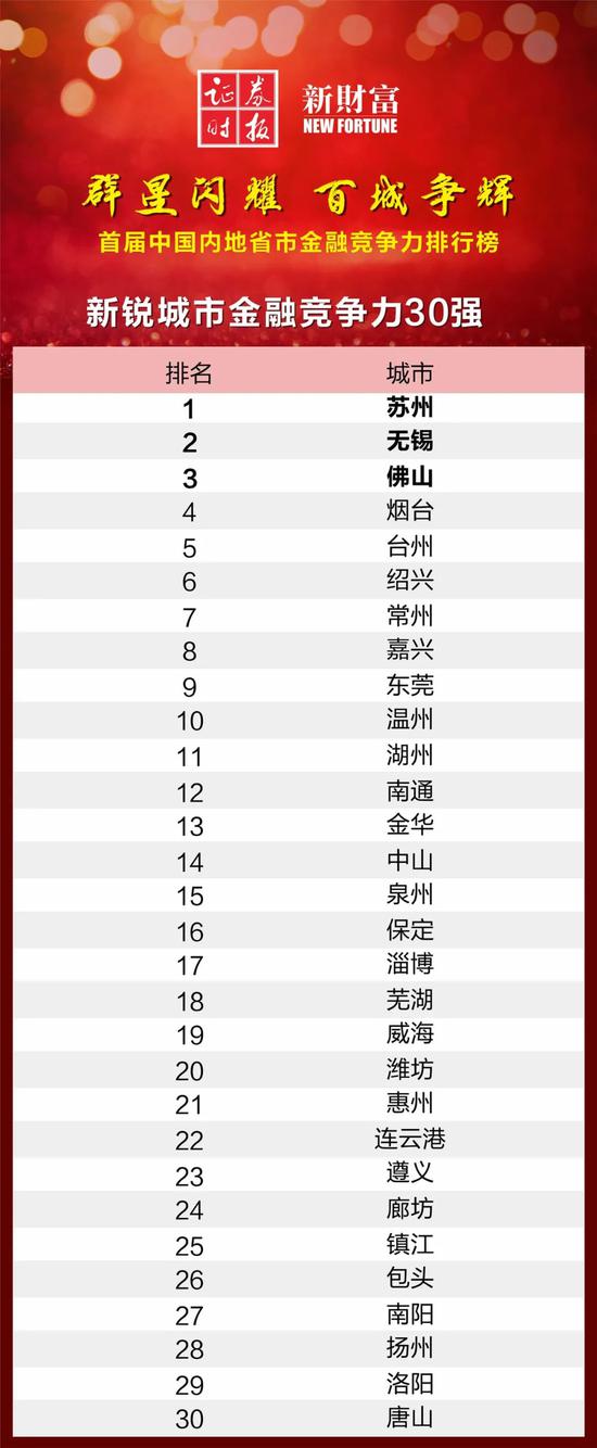除传统金融中心城市外,一批新锐城市的金融竞争力也值得关注,苏州、无锡、佛山位列“新锐城市金融竞争力30强”前三甲。新锐城市金融竞争力地区分化现象明显,江苏、浙江、山东、广东4省合计占21家,占比达七成。