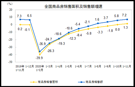 1-11月份,商品房销售面积150834万平方米,同比增长1.3%,增速比1-10月份提高1.3个百分点。其中,住宅销售面积增长1.9%,办公楼销售面积下降12.8%,商业营业用房销售面积下降11.1%。商品房销售额148969亿元,增长7.2%,增速提高1.4个百分点。其中,住宅销售额增长9.5%,办公楼销售额下降10.7%,商业营业用房销售额下降13.7%。