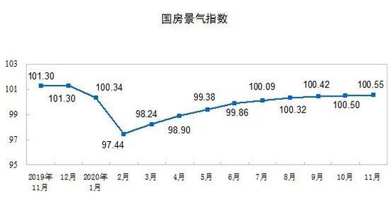 房地产行业景气度进一步上升。11月份,国房景气指数为100.55,比10月份提高0.05点。这也是国房景气指数连续第五个月回到100点上方。根据统计局解释,国房景气指数100点是最合适的景气水平,表明当前房地产景气度处于合理区间。