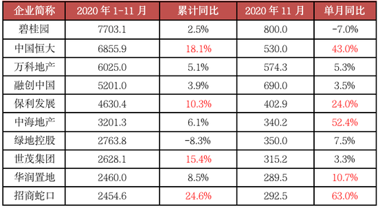 另外,克而瑞统计数据显示,从企业业绩表现来看,2020年11月,TOP100房企中有超7成企业实现单月业绩同比提升。截至11月末,已有近8成房企累计业绩超过去年同期,实现同比增长。累计来看,恒大、保利、世茂、招商同比提升较为明显,分别为18.1%、10.3%、15.4%、24.6%。其中恒大无论是单月还是累计同比增长表现都较为优异。