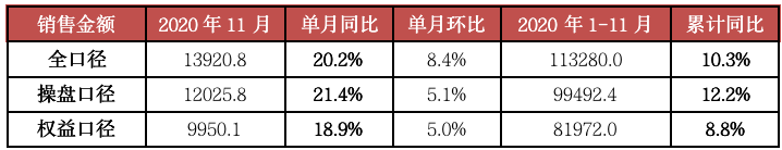 此前克而瑞披露的11月房企销售数据显示,2020年11月,TOP100房企实现销售操盘金额12025.8亿元,单月业绩同比增长21.4%,环比较上月小幅上升5.1%。实现全口径金额13920.8亿元,同比增长20.2%,环比增长8.4%,累计来看,前11月TOP100房企实现销售操盘金额99492.4亿元,实现全口径金额113280.0亿元,累计同比分别为12.2%与10.3%。