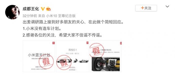 12月15日,小米公关部副总经理王化回应“小米跟比亚迪联合造车”传闻,称小米没有造车计划,希望大家不信谣不传谣。小米总办副主任徐洁云也在微博上称“掌握一个原则就行:但凡说小米要造车的,都是假新闻。”
