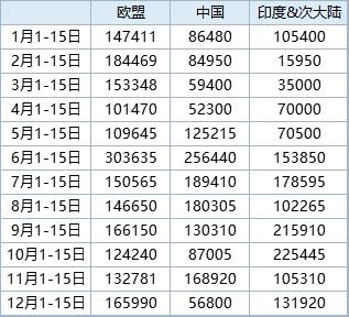 据船运调查机构ITS公布的数据显示,12月1-15日马来西亚对印度棕榈油出口量为131920吨,较上月同期增逾25%,增幅较前10日继续扩大。11月底印度将毛棕榈油进口关税从37.5%大幅下调至27.5%,毛棕榈油进口关税的下调或将在未来几个月鼓励更多的棕榈油进口,而减少软油进口量;马来对欧盟棕榈油出口量为165990吨,较上月同期增长25%,但涨幅较前10日大幅收窄;本月前15日马来对中国棕榈油出口量为56800吨,较上月骤降逾66%,刷新八个月低位。