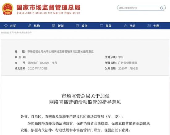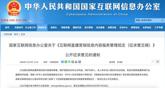 11月5日,市场监管总局发布《关于加强网络直播营销活动监管的指导意见》;11月13日,国家互联网信息办公室就《互联网直播营销信息内容服务管理规定(征求意见稿)》向社会公开征求意见;11月23日,国家广播电视总局也发布了《关于加强网络秀场直播和电商直播管理的通知》。