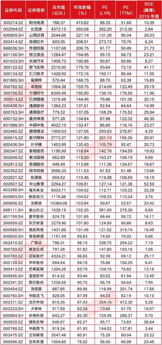 统计数据显示,截至上周五(12月11日)收盘,A股市场全部上市公司中,总市值大于500亿元、分别以最近4个季度净利润、2019年净利润计算的市盈率皆大于50倍的上市公司共94家,94家公司平均的市盈率为79.8倍,这些公司今年以来股价的平均涨幅为82.8%;剔除今年上市的新股后共83家,83家公司平均的市盈率为78.6倍,这些公司今年以来股价的平均涨幅为84.85%;83家公司中,涨幅大于100%的有33家。今年以来截至上周五收盘上证综指、沪深300指数涨幅分别为9.74%和19.36%,这些股票的涨幅显著高于同期市场主要指数的涨幅。