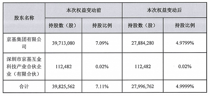 权益变动后,京基集团及其一致行动人的持股比例从7.11%下降为4.9999%。很明显,持股比例低于5%,京基集团若后续又减持的话,将方便很多。