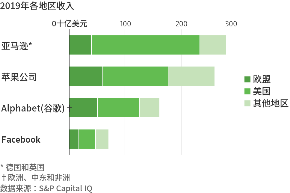 过去,企业可以避开严格的国家新规。2014年,谷歌关闭了西班牙新闻服务,以回应当地要求其为新闻内容付费的规定。欧洲目前的监管行动范围广泛,谷歌的这种策略如今几乎不可行,即使各国的做法不同。总体而言,该地区在苹果公司和Facebook 2019年收入中的占比略低于四分之一。