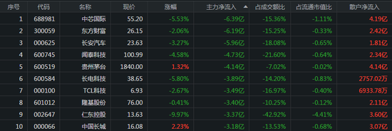 从个股来看,中芯国际、东方财富、长安汽车分别遭主力资金卖出6.39亿元、5.14亿元、4.65亿元。