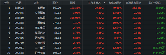 从个股来看,主力资金最青睐的3只股票分别是N恒玄、立讯精密、N航亚,流入金额分别为23.39亿元、7.33亿元、6.82亿元,所对应的涨幅分别为123.36%、3.95%、355.08%。