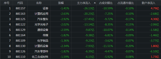 主力资金流出的板块分别是证券、计算机应用、汽车整车,主力资金流出金额分别为26.13元、20.23亿元、17.45亿元,其中散户净流入金额为4.79亿元、-2.68亿元、4.30亿元。