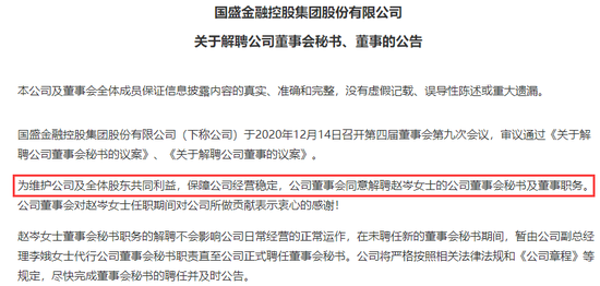 12月15日,国盛金控公告称,为维护公司及全体股东共同利益,保障公司经营稳定,公司董事会同意解聘赵岑的公司董事会秘书及董事职务。