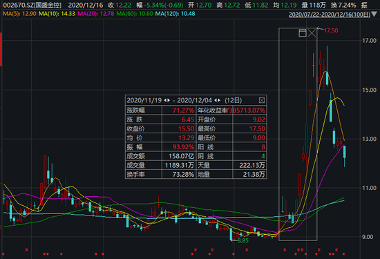 11月19日,国盛金控突然涨停,随后展开了一波低价券商股的牛市行情,在12个交易日最高上涨94%。