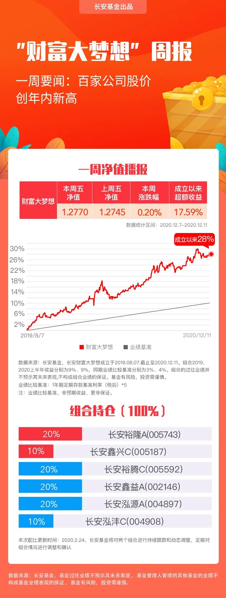 上周我们的“投资小确幸”、“财富大梦想”基金组合均小幅上涨,整体上看,偏股子基金占比为10%左右的“投资小确幸”基金组合小幅上涨0.08%。偏股子基金占比为30%左右“财富大梦想”基金组合上涨0.20%,组合保持延续了平稳的表现。我们将继续以追求“绝对收益”为目标,为投资者创造价值。