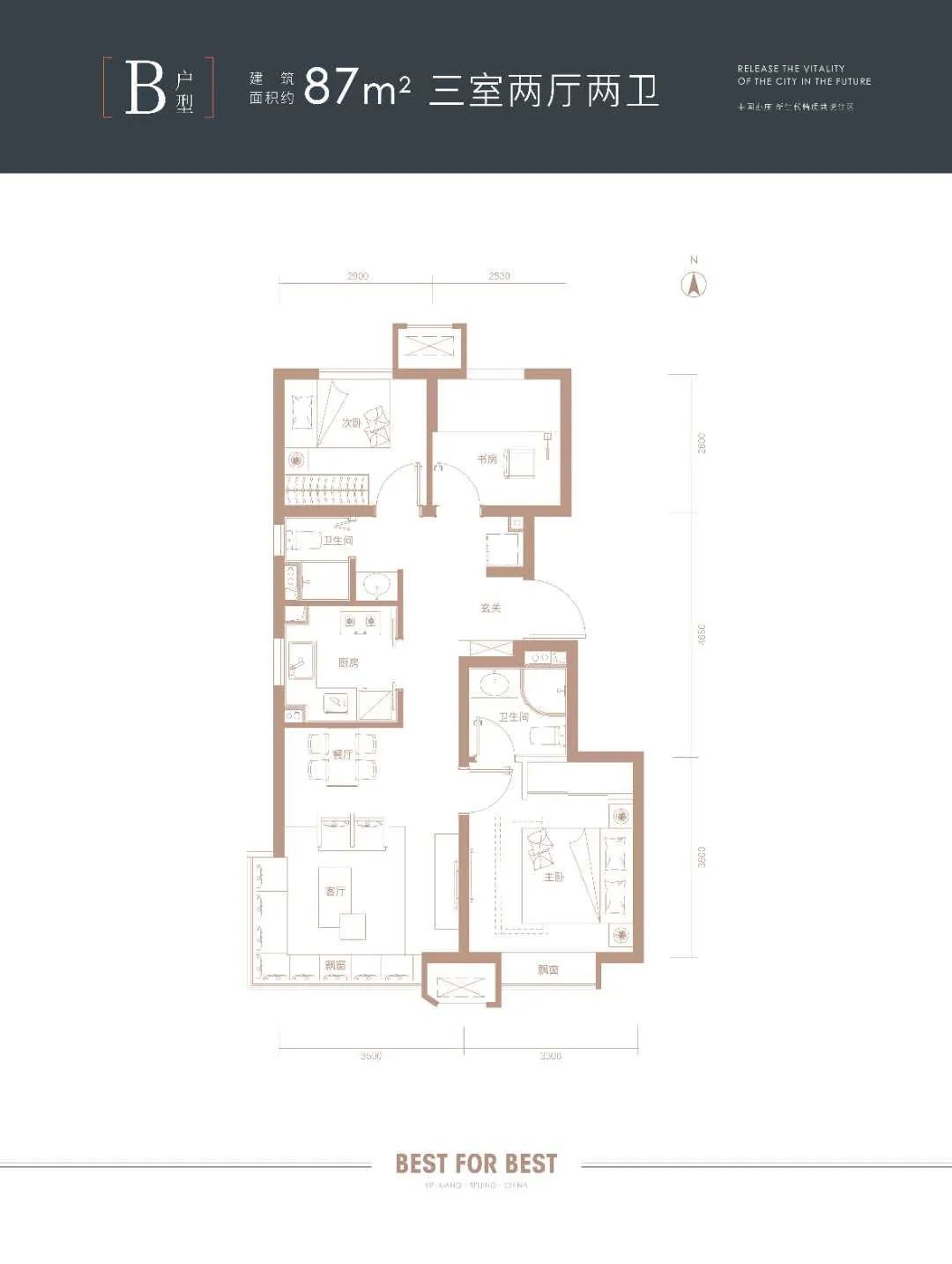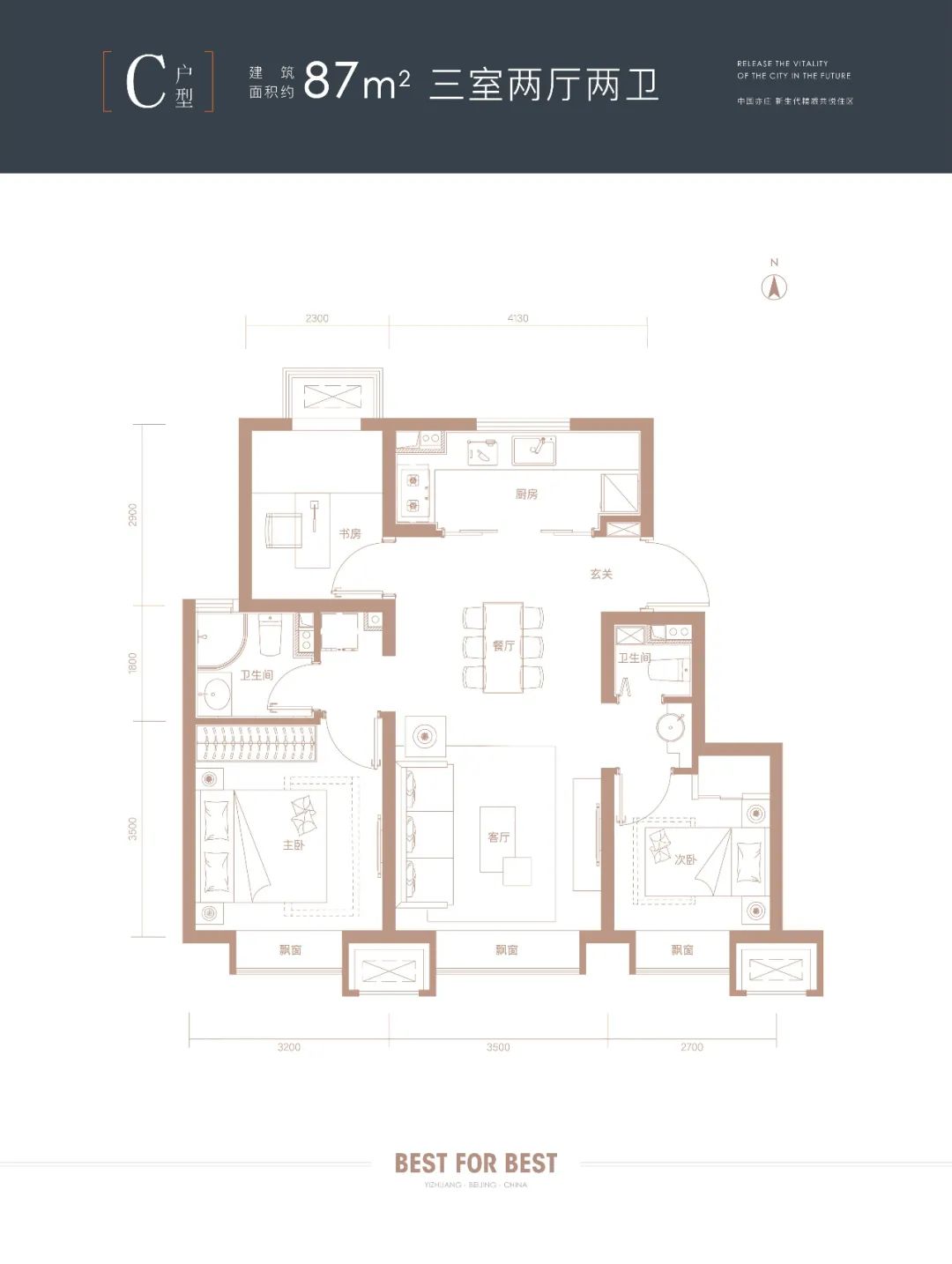 除了边户产品,金悦郡在另一个87平米的三居户型中,实现了三面宽朝南,并将南向面宽做到了9.4米,进深近为8.2米,这在当下相同尺度的三居产品中,可以说很难看到如此标准的大面宽短进深的产品。此外,南向三个房间都设置了飘窗,有效扩展了整个居室的使用空间,也使得功能分区更加合理。