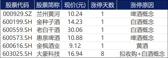 A股涨停数量连续三日下降,好在酿酒板块表现不错撑起了盘面。共有兰州黄河(000929.SZ),金种子酒(600199.SH)、老白干酒(600559.SH)、惠泉啤酒(600573.SH)、金枫酒业(600616.SH)、大豪科技(603025.SH)六只酿酒股涨停。