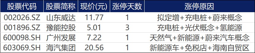 新能源车长期在涨停榜霸榜,A股新能源车概念股过多是重要原因之一。今日有山东威达(002026.SZ)、豫能控股(001896.SZ)、广州发展(600098.SH)、海汽集团(603069.SH)四只个股涨停。