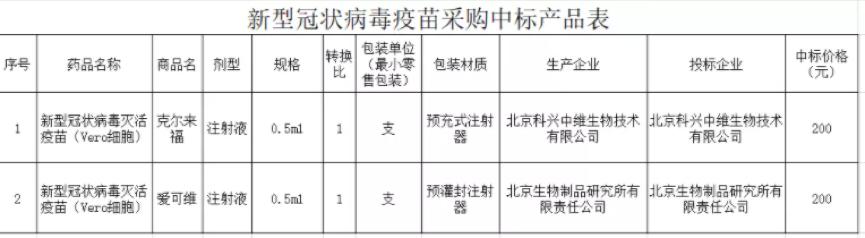 日前,江苏省药品(医用耗材)阳光采购和综合监管平台发布《省公共资源交易中心关于公布新型冠状病毒疫苗采购结果的通知》,北京科兴中维生物技术有限公司和北京生物制品研究所有限公司中标,中标价格均为200元/支。