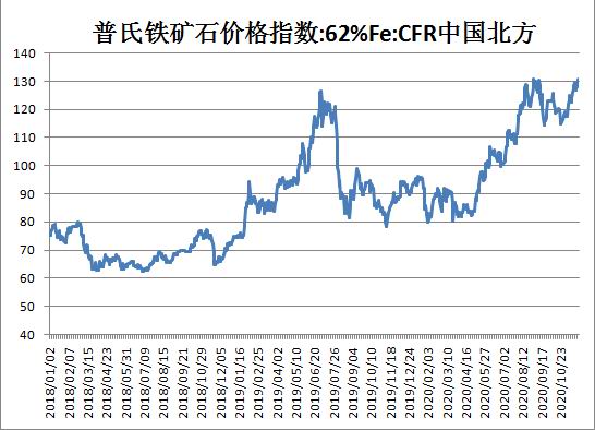 11月份,铁矿石现货价格先抑后扬。月初矿价整体表现疲软,由于国内铁矿石港口库存持续增加,叠加京津冀地区因环保趋严部分钢厂高炉开工率下调抑制铁矿石现货需求。但进入11月中旬伴随着澳巴铁矿石总发运量下降、河北疏港解除限制推动港口库存下滑及钢材价格持续走高带来支撑,矿价重心逐步上移。截止11月27日普氏62%铁矿石现货指数为130.95美元/吨,较11月30日117.95美元/吨,涨13美元/吨,涨幅为11%。