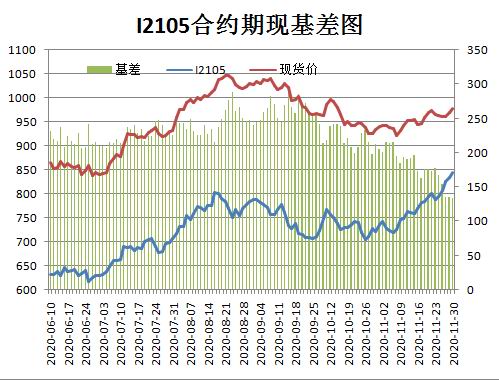 11月30日青岛港62%澳洲粉矿现货价为978元/干吨,期货I2105合约价格为844元/吨,基差为134元/吨,由于当前期价远低于现货价格,因此若企业需买入大量铁石现货可考虑通过期货市场分批做多I2105合约套保。