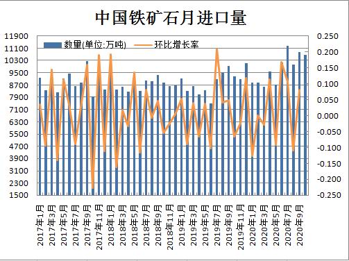 据海关总署公布的数据显示,2020年10月,中国进口铁矿砂及其精矿10674.2万吨,月环比下降1.66%,但与去年同期比较增加13.9%;1-10月份,中国累计进口铁矿石97520.4万吨,同比增加9836.1万吨,增幅11.2%。国内铁矿石进口量连续五个月维持在1亿吨上方,体现出国内高需求,但随着钢厂高炉开工率下调,铁矿石现货供应将由偏紧逐步转向宽松。