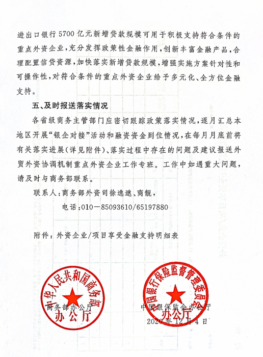 中国网财经12月17日讯 据商务部网站17日消息,12月10日,商务部办公厅、银保监会办公厅联合印发《关于贯彻落实国务院部署给予重点外资企业金融支持有关工作的通知》,指导各地商务主管部门和银保监局做好《国务院办公厅关于进一步做好稳外贸稳外资工作的意见》(国办发〔2020〕28号)落实工作,加大对重点外资企业金融支持力度。