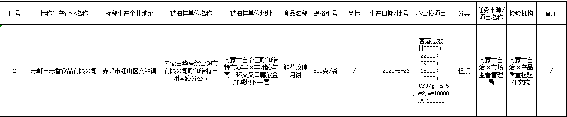 其中,不合格产品信息第2项显示,由内蒙古华联综合超市有限公司呼和浩特丰州南路分公司销售的、标称赤峰市赤香食品有限公司生产的鲜花玫瑰月饼(规格型号:500克/袋;生产日期/批号:2020-8-26),菌落总数不合格。5次菌落总数检测结果分别为25000CFU/g;22000CFU/g;29000CFU/g;15000CFU/g;15000CFU/g,标准值为n=5,c=2,m=10000,M=100000。检验机构为内蒙古自治区产品质量检验研究院。