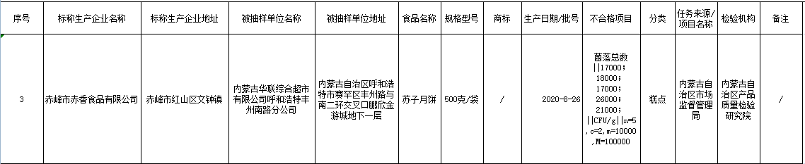 不合格产品信息第3项显示,由内蒙古华联综合超市有限公司呼和浩特丰州南路分公司销售的、标称赤峰市赤香食品有限公司生产的苏子月饼(规格型号:500克/袋;生产日期/批号:2020-8-26),菌落总数不合格。5次菌落总数检测结果分别为17000CFU/g;18000CFU/g;17000CFU/g;26000CFU/g;21000CFU/g,标准值为n=5,c=2,m=10000,M=100000。检验机构为内蒙古自治区产品质量检验研究院。
