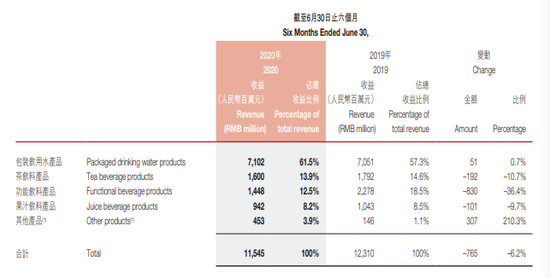相对而言,农夫山泉的饮料业务受影响较大。茶饮料和果汁饮料受疫情影响,上半年分别实现收入16亿元和9.42亿元,同比下降10.71%和9.68%。功能性饮料由于学校、运动场馆等消费场所关闭,收入同比下降36.44%至14.48亿元。