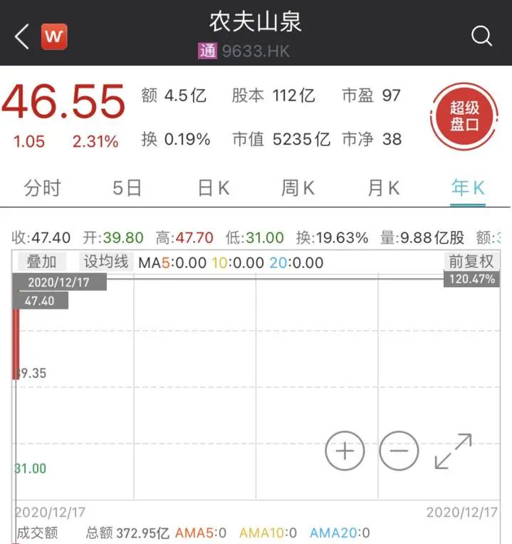 今日(12月17日)午后,农夫山泉(9633.HK)股价持续拉升,一度涨4.84%至47.7港元/股,再创历史新高,市值超5300亿港元。截至发稿,农夫山泉涨2.31 %,报收46.55港元/股。自今年9月IPO以来,农夫山泉股价已累计涨超120%。
