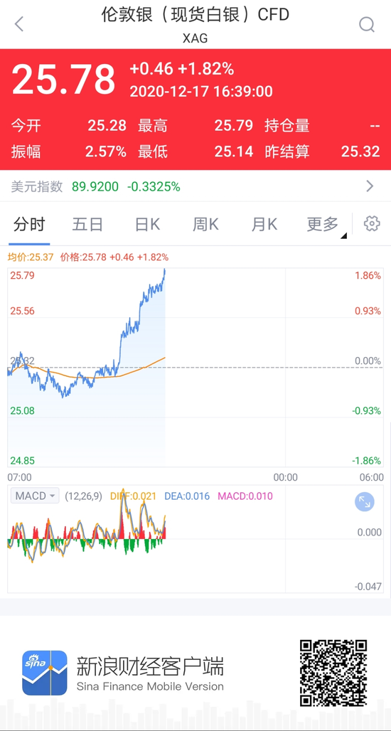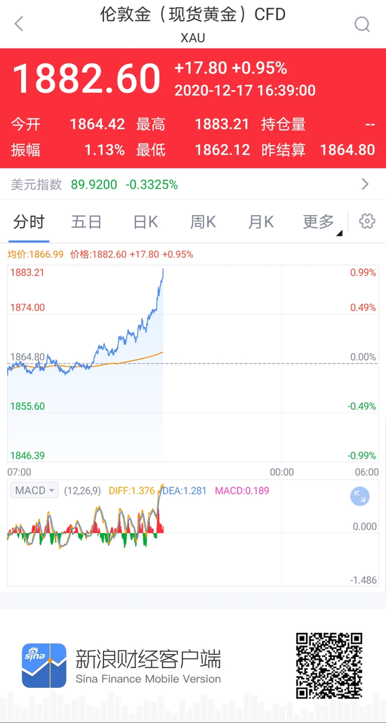 12月17日欧盘,现货黄金冲破1880美元大关现报1882.60美元/盎司。 现货白银涨幅扩大至近2%,现报25.78美元/盎司。