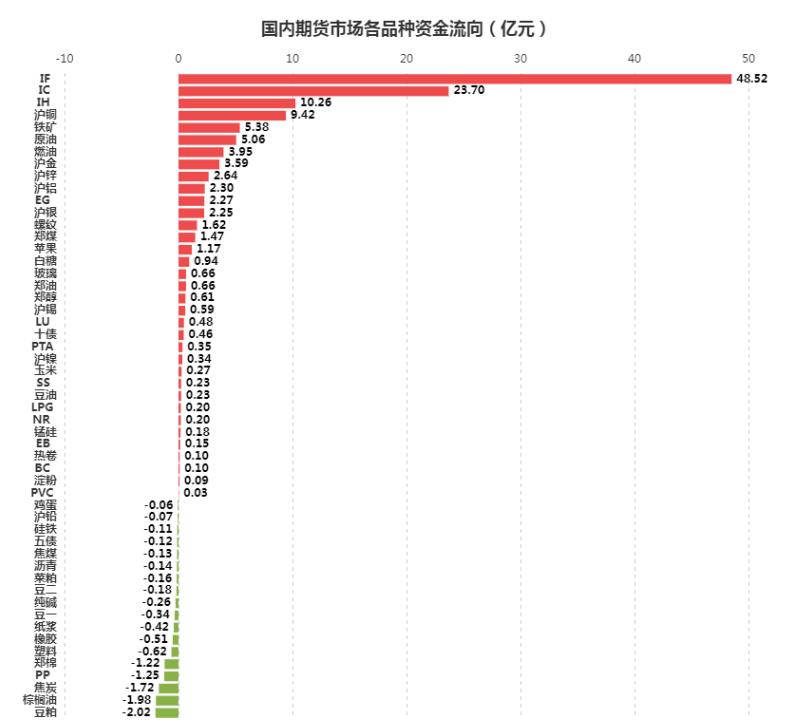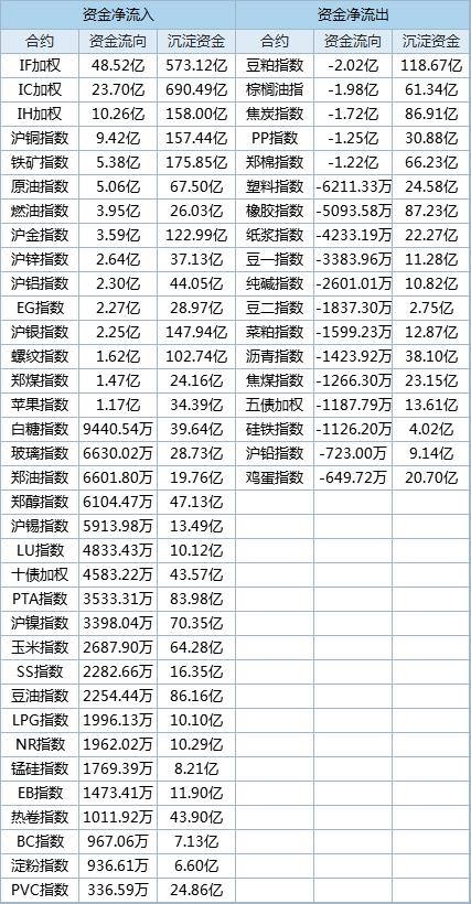 文华财经(编辑 那娜)--沪铜即将换月,今日小幅走高,独自吸纳9.42亿资金,原油系旗下的燃油及SC原油两品种合力吸金近9亿,钢材板块仍保持强势,尤其铁矿石期货在历史高位附近连涨三日,独得5.38亿资金宠爱。油脂链整体偏弱,豆粕及棕榈油均有2亿左右资金流出,资金显然更为关注工业品市场。外围市场传来好消息,股指期货受提振全线上涨,大量资金流水般涌入市场。