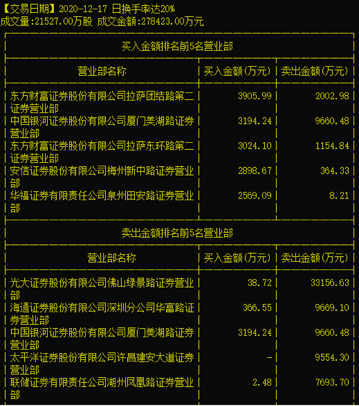 盘后龙虎榜显示,12月17日当天卖出最多的系光大证券佛山绿景路营业部,卖出金额高达3.32亿元;海通证券深圳分公司华富路营业部、银河证券厦门美湖路营业部、太平洋许昌建安大道营业部的卖出金额分别为9669.1万元、9660.48万元、9554.3万元,也不容小觑;位列卖5的是联储证券湖州凤凰路营业部,卖出金额7693.7万元。