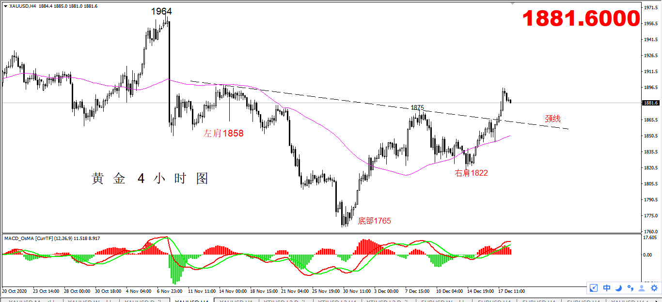 上个交易日金价继续延续上行,突破了头肩底颈线位置的支撑,日线最终以一根饱满的大阳线收录,涨幅高达50美金,多头动能得到进一步的释放,目前金价已经突破了头肩底颈线以及MA60均线两个位置的关键阻力,据我们的下一个上涨目标位1913也越来越近了,追究近期这两天上涨的原因,主要总结为三点,其一为日线头肩底的底部形态已经形成,其二为时间节点,据统计2000年以来,每月12月之后的1-3个月,黄金通常有一波上涨行情,近二十年,有17年上涨,1年走平(2000年),2年下跌(2005和2012),上涨的概率是85%,走平的概率是5%,下跌的概率是10%,其三为美联储决议的靴子落地,而这三点也是近期不断在文章包括直播时2所提醒大家的,对于今天的黄金而言,在昨天的大幅上涨之后,临近今天周线收盘,所以并不指望黄金今天能够有较大的波动,或者是突破前高,以修正为主的概率会偏大,操作方面关注短线修正结束后的做多机会。