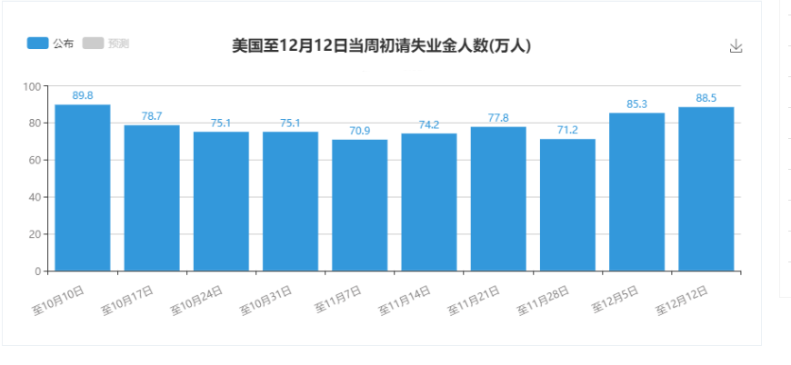 美国至12月12日当周初请失业金人数录得88.5万人,为10月10日当周以来新高。美国上周初请失业金人数意外上升,因新冠疫情继续施压经济,而国会议员仍在努力推动新的政府援助计划。同时,12月份美国费城联储制造业指数录得11.1,至6月以来的最低水平。费城联储表示,12月份参与制造业商业前景调查的企业表示,该地区制造业活动继续增长,但增长的广泛性有所减弱。