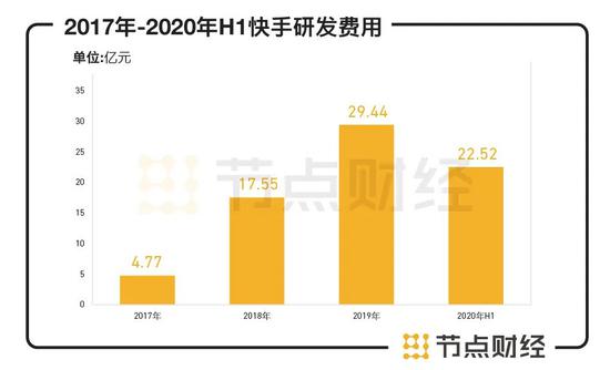 节点财经发现,快手的销售费用主要由推广及广告支出构成,近年来一直占整体销售费用的90%以上。2017-2018年,公司销售费用从13.60亿元增长至42.62亿元,增幅超过200%;2019年,公司营销费用增长一倍多,达到98.65亿元,其中主要花费在手机预装、平台促销、品牌推广等方面。