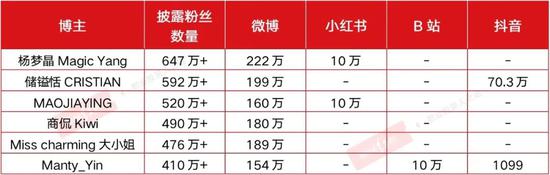 另据披露,Miss charming大小姐、Fit4life和Manty_Yin等三位博主,公告显示其粉丝数量均在400万以上,但记者统计的截止12月17日的数据和其公告披露的数据也并不相符。另外,记者浏览了其微博内容,发现其互动量也不高,大多数微博下面的转发量和评论量不超过100条。该公司头部博主的粉丝及互动情况尚且如此,更不用说其公司的其他博主了。