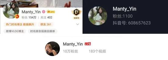 图6 Manty_Yin新浪微博、B站、抖音粉丝数量截图