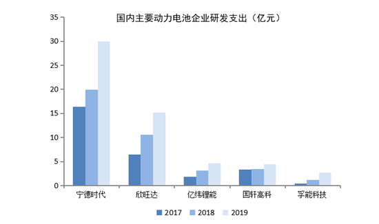 更让人绝望的是,宁德时代研发投入金额远高于二线企业,且持续增加。自2014年以来,宁德时代的研发支出复合增速为124.32%;到了2019年,宁德时代的研发支出已经高达30亿,差距显而易见。