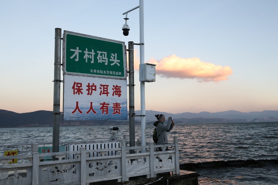 12月11日,大理才村码头,游客在拍摄黄昏时的苍山洱海景色。(中国日报记者 武晓慧 摄)