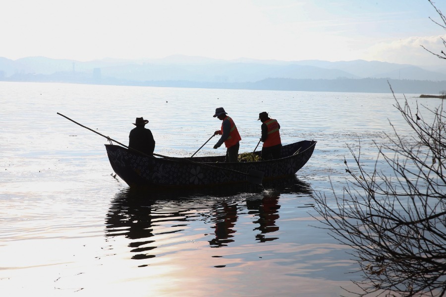 12月11日,大理洱海,打捞水草和垃圾的清洁员。(中国日报记者 武晓慧 摄)
