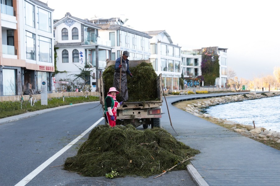 12月12日,大理洱海生态廊道上,清洁员运输打捞上来的水草。(中国日报记者 武晓慧 摄)
