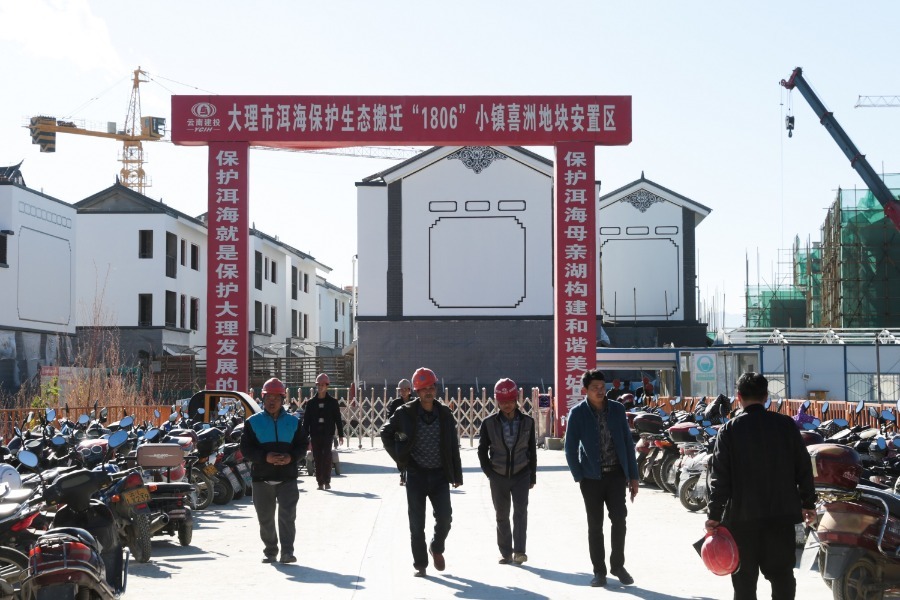12月13日,工人从大理市洱海保护生态搬迁“1806”小镇喜洲地块安置区建设工地走出。(中国日报记者 武晓慧 摄)