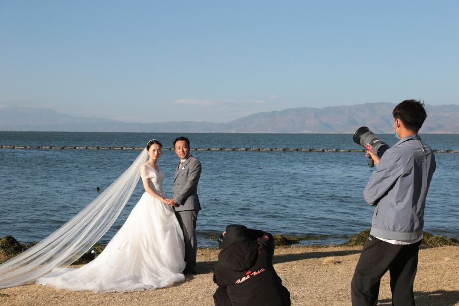 12月12日,游客在洱海边拍摄婚纱照。(中国日报记者 武晓慧 摄)