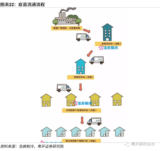 流通阶段主要涉及疫苗流通企业以及冷链运输设备。2016年4月,国务院通过《国务院关于修改<疫苗流通和预防接种管理条例>的决定》,规定将疫苗的采购全部纳入省级公共资源交易平台。具体流程为,市、县疾控中心汇总需求上交至省疾控中心,省疾控中心通过平台组织全省集中采购,确定中标的生产企业、品种、规格和价格。生产企业必须通过省级交易平台完成销售,同时需要直接或者委托物流配送企业完成疫苗配送,配送环节要求全程冷链运输。