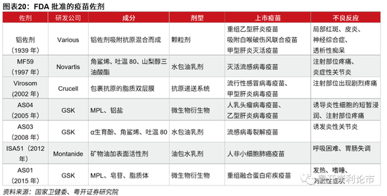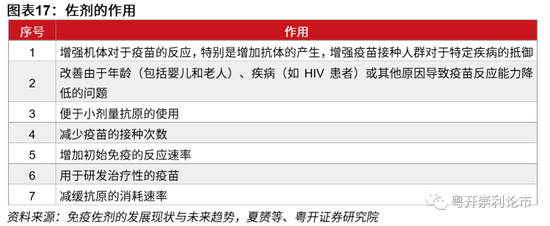 免疫佐剂可增强或调节机体免疫原性。免疫佐剂简称佐剂,为非特异性免疫增生剂,是指同抗原一起或预先注入机体内增强机体对抗原的免疫应答能力或改变免疫应答类型的辅助物质。对于疫苗而言,部分疫苗,如类毒素疫苗、亚单位疫苗将病原微生物的一部分抗原人为地纯化出来,这些抗原引起的免疫反应能够诱导机体抵御病原微生物。由于这类疫苗没有病毒核酸,无法在人体内复制,安全性较高,但缺点在于无法诱导机体产生较强的免疫反应等。因此,对于这类疫苗,往往需要一些物质来增强或调节人体免疫原性,这些物质即为佐剂。