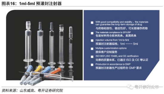 目前预灌封注射器的主要供应商为山东威高。山东威高普瑞医药包装有限公司是隶属于威高集团医用高分子制品股份有限公司。是中国第一家取得注册证的预灌封注射器生产厂家,年生产预灌封注射器能力达1.5亿支,生产设备和生产技术达到国际一流水平。根据山东威高普瑞医药包装有限公司官网,在7月16日新冠疫苗企业产融对接座谈会上,威高普瑞总经理倪世利表示:“自疫情发生以来,威高为确保新冠疫苗用预灌封产品供应,在厂房建设、原料储备、设备采购等方面积极应对,投资建设了10万平方米的生产厂房,设备到位后将实现年产能16亿支以上。目前,第一个新车间已投入使用,并计划于2021年全部建成投产,届时威高预灌封产能将突破6亿支。”而根据全景网信息,山东药玻9月末在全景网回复投资者“目前没有新冠疫苗方面的订单。”我们认为,山东威高为国药和科兴灭活疫苗预灌封注射器的主要供应商。