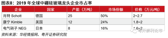 中硼硅玻璃价格高昂,长期处于进口垄断局面。目前我国尚未大面积推广中硼硅玻璃的使用,主要基于二点原因:第一,中硼硅玻璃价格高昂。德国肖特公司生产的中硼硅玻璃管价格约为27000元/吨,国内低硼硅玻璃管价格约为7000元/吨,前者的价格约为后者的四倍;第二,全球中硼硅玻璃进口垄断现象严重。全球中硼硅玻璃市场长期被德国肖特、日本电气硝子和美国康宁垄断,三家公司2019年全球市占率达90%。