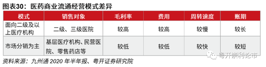 医药流通是连接上游医药生产企业和下游医疗机构、零售终端的中间环节。医药流通企业从上游医药生产企业采购药品,然后再批发给下游的医疗机构、零售药店和下游分销商等,通过交易差价及提供增值服务获取利润。我国医药商业流通企业的经营模式可分为“面向二级及以上医疗机构为主的经营模式”以及“以市场分销为主的经营模式”两种。前者的模式是指医药流通企业以二级、三级医院为主要销售对象,代表企业包括国药控股、上药医药等,后者的模式是指医药流通企业以基层医疗机构、民营医院、零售药店等市场化客户为主要销售对象,提供药品销售及配送服务,代表企业包括九州通等。