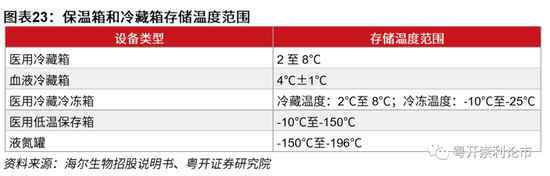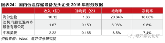 海尔生物为国内低温存储设备龙头,2019年收入破十亿元。国内深耕于低温存储设备的企业主要包括澳柯玛、海尔生物、中科美菱等。青岛澳柯玛超低温冷冻设备有限公司成立于2011年,是澳柯玛股份有限公司的控股子公司,主要产品包括血液冷藏箱、医用冷藏箱、医用低温保存箱等。海尔生物成立于2005年,掌握超低温制冷核心技术,公司在复叠式低温制冷系统设计、多级制冷混合制冷剂制备、高效换热技术等核心技术的研发上处于全球领先地位。中科美菱由合肥美菱股份有限公司和中国科学院理化技术研究院于2002年成立,目前涉足的主要业务包括医用低温保存箱、专业冷库等。